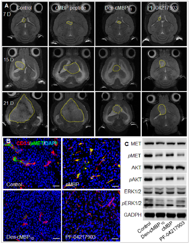 活体磁共振成像表明,与cMBP多肽相比,Den-cMBP10更好抑制U87MG原位移植瘤的生长,延长荷瘤小鼠的生存期,其抗肿瘤效果与正在进行临床实验的小分子MET抑制剂PF-04217903相当。移植瘤切片的免疫荧光染色显示Den-cMBP10治疗显著降低肿瘤组织pMET的表达量,免疫印迹结果也显示Den-cMBP10治疗降低了小鼠肿瘤MET及其下游信号蛋白的磷酸化。