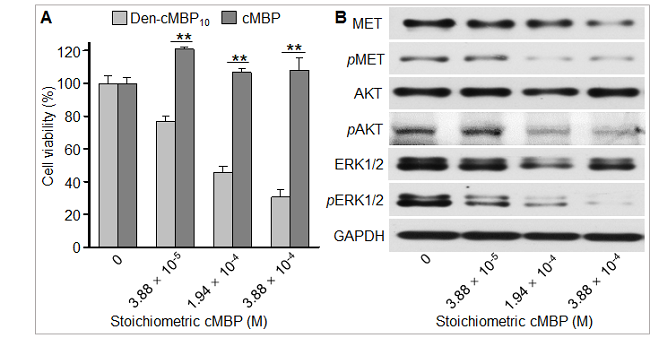 图3. 纳米抑制剂Den-cMBP10抑制MET受体及其下游信号蛋白的磷酸化阻止肿瘤细胞生长。