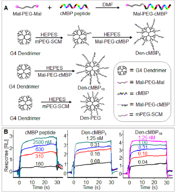 图2. (A) 纳米抑制剂及对照探针的合成。(B) 表面等离子共振测量游离多肽和纳米抑制剂与MET蛋白的结合常数。