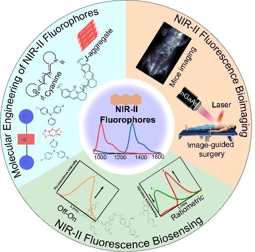 小分子荧光染料是荧光成像与传感技术在生物医学研究中得以发挥重要作用的有力工具。相比于传统技术采用的短波段(400~900 nm)荧光,近红外二区(NIR-II,1000~1700 nm)荧光可显著降低生物组织的散射以及自发荧光干扰,因而极大地提高了成像分辨率和成像深度。截至现在,用于近红外二区荧光生物成像的材料主要有单壁碳纳米管、量子点、稀土纳米颗粒以及有机小分子染料和聚合物等,在这些NIR-II生物成像材料中,有机小分子在可修饰性、潜在的临床转化等方面具有独特的优势。因此,如何获取高性能的近红外二区荧光染料成为该领域研究的当务之急。
