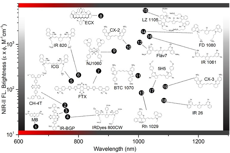 首先,作者讨论了高性能NIR-II荧光染料需要考虑的三个参数:波长、亮度以及稳定性。在这三个参数的指导下,作者详细探讨了如何实现染料波长的红移,包括延长共轭链、修饰推拉电子体系、杂原子替换以及形成J-聚集体等方式;接着讨论了提高亮度的策略,包括空引入空间位阻、与蛋白形成复合物、修饰推拉电子体系以及AIE等;最后探讨了如何提高染料稳定性的策略,包括引入空间位阻、刚性化染料分子结构等,每种策略都有相应的例证。此外,作者总结了一个最大吸收波长与亮度的关系图,此图清晰的展示了目前绝大部分用于NIR-II区生物成像的小分子染料相关参数,具有很好的参考价值。
