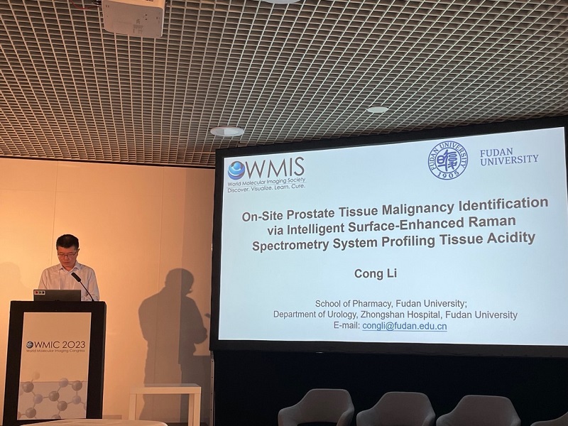 2023年9月7日,李聪教授在世界分子影像大会WMIC“Image Guidance and Microscopy” 分会场进行了题为:”On-site Prostate Tissue Malignancy Identification via Intelligent Surface-enhanced Raman Spectrometry System Profiling Tissue Acidity”的报告。该工作介绍了一类在体快速检测肿瘤相关代谢分子的创新仪器,用于术中引导肿瘤浸润区域定位和完整切除。该仪器由取样模块、检测模块和配准模块构成,分别负责手术切面代谢分子样本的提取,目标分子事件检测和分子信息融合配准。通过对108列前列腺穿刺患者组织检测,验证了该仪器通过检测组织酸化程度定位前列腺癌阳性手术边界的可行性。该设备有望帮助外科医生术中准确识别阳性手术边界,提高手术预后。
