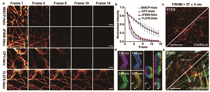 图4. 高光稳定性YL578-Halo探针用于3D-STED成像及活细胞STED成像。