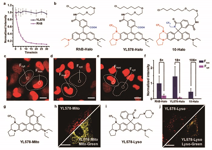 为了将YL578用于蛋白质特异性标记,作者将HaloTag底物偶联在YL578上,构建了用于标记Halo蛋白的荧光探针(图3a-3f)。相较于RhB-Halo,YL578-Halo不仅具有更高光稳定性,而且在免洗标记中也展示出更高的成像信噪比。通过对YL578染料的简单修饰,也可构建出用于活细胞中线粒体和溶酶体的特异性标记和实时成像的荧光探针(图3g-3j)。