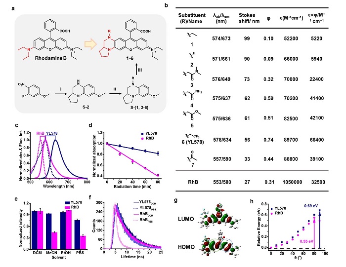 基于以上协同策略,作者开发了YueLu染料(YLs)。通过引入四氢吡嗪基团使染料的HOMO轨道表现出不对称的电子云分布,同时引入不同Hammett常数的取代基精确调控四氢吡嗪端的电子云密度,增加染料激发态振动弛豫并抑制分子内扭转电荷转移(TICT),进而协同增加染料的光稳定性、亮度以及Stokes位移(图2a-b)。体外测试证明,相较于罗丹明B, YL578染料具有更好的光稳定性、亮度以及Stokes位移(图2c-2h)。