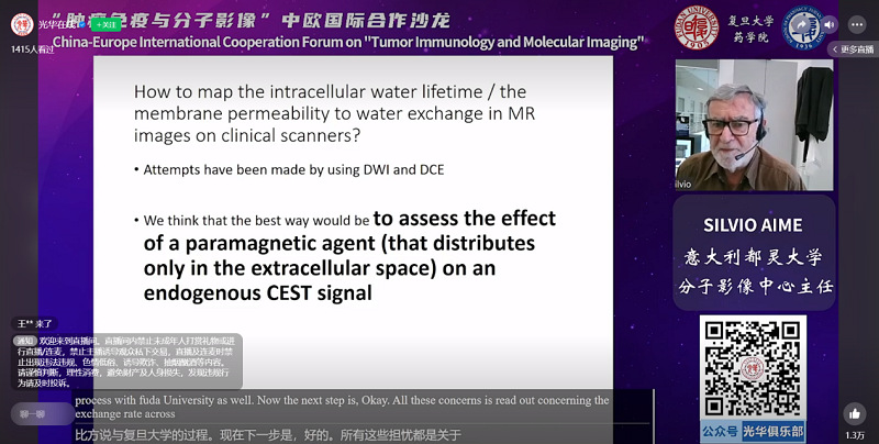 意大利都灵大学分子成像中心负责人Silvio Aime教授的演讲题目为Mapping water cycling across cellular membranes, a hallmark of tumor metabolism,介绍了利用磁共振成像技术追踪水在细胞膜间运动的创新技术。这项工作在肿瘤边界可视化和药物发现方面均有应用前景,并有可能为深入了解癌症提供可视化工具。