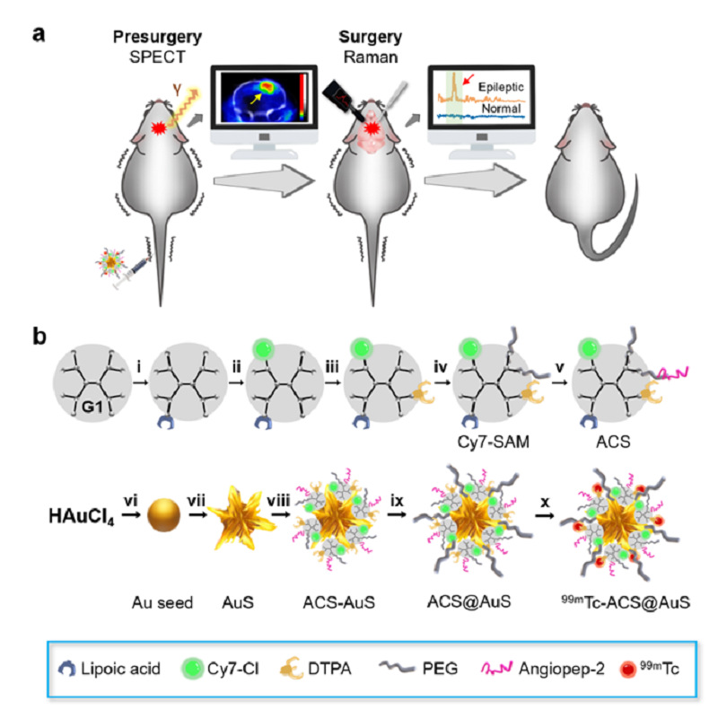 图1. 探针99mTc-ACS@AuS的设计与合成。(a)术前利用SPECT成像获取致痫灶位置信息,术中利用SERRS勾勒致痫灶边界并引导手术切除。(b)探针合成过程:(i)硫辛酸;(ii)Cy7-Cl;(iii)DTPA;(iv)MAL-PEG5K-NHS;(v)半胱氨酸修饰的Angiopep-2;(vi)柠檬酸钠;(vii)抗坏血酸,AgNO3;(viii)ACS;(ix)HS-PEG5K-OMe;(x)氯化亚锡,99mTcO4。