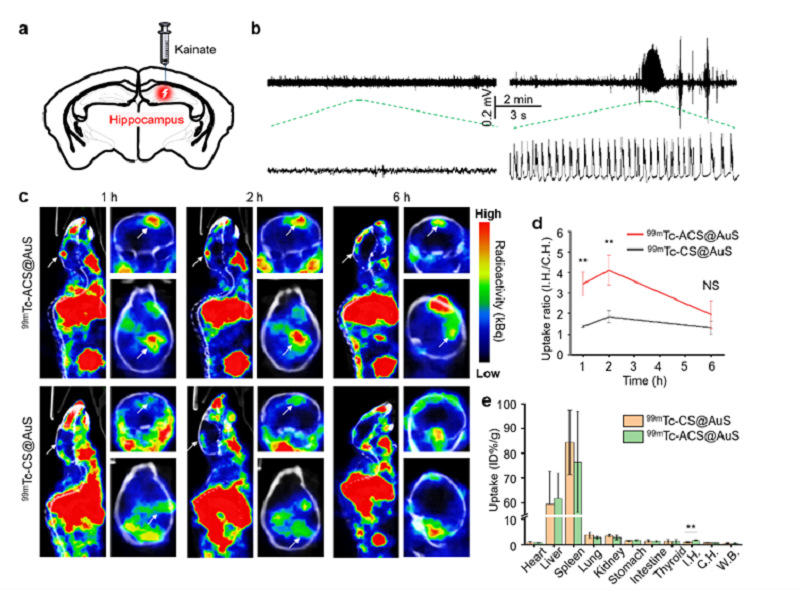 图6. 99mTc-ACS@AuS在体SPECT成像。(a)海人酸诱导癫痫小鼠模型示意图。(b)癫痫小鼠模型和对照小鼠的颅骨脑电图。(c)静脉注射探针后1、2、6小时癫痫小鼠SPECT/CT影像。(d)SPECT图中放射性信号定量分析(同侧海马/对侧海马)。(e)99mTc-ACS@AuS和99mTc-CS@AuS在癫痫小鼠体内的生物分布。