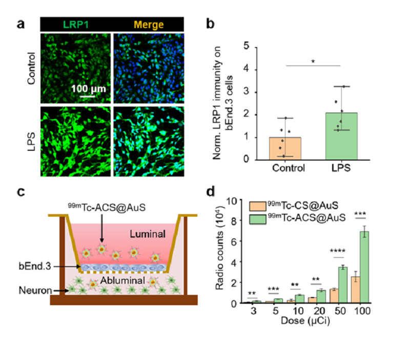 图4. 99mTc-ACS@AuS体外跨BBB效率高。(a)LPS或PBS处理bEnd.3的LRP1免疫荧光图像。(b) LRP1免疫荧光强度半定量分析。(c) 体外BBB模型示意图。(d) 放射性计数定量分析99mTc-ACS@AuS及99mTc-CS@AuS跨BBB的效率。