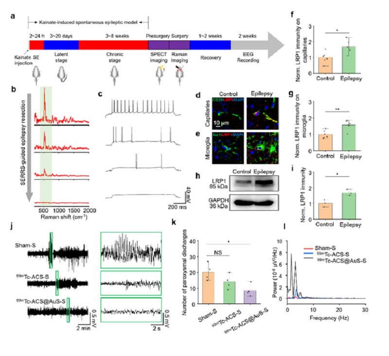 图7. 99mTc-ACS@AuS引导癫痫小鼠致痫灶切除。(a)实验流程图。(b)拉曼引导癫痫手术。99mTc-ACS@AuS的特征拉曼光谱标注为浅草绿色。(c)切除组织的膜片钳分析。(d和e)切除组织的血管内皮细胞(d)和小胶质细胞(e)的LRP1免疫荧光染色图像。(f和g)手术切除组织中血管内皮细胞(f)和小胶质细胞(g)LRP1免疫荧光强度半定量分析。(h)手术切除组织LRP1蛋白免疫印迹。(i)免疫印迹中LRP1表达水平半定量分析。(j)切除手术后癫痫小鼠的代表性脑电图。(k)癫痫手术后阵发性放电的次数。(l)癫痫手术后的脑电图功率谱。