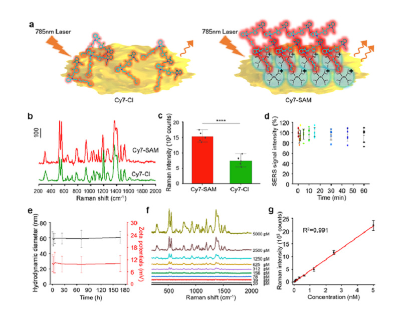 图3. ACS@AuS的拉曼成像性质。(a)拉曼信号增强的推测机制。(b)Cy7-SAM和Cy7-Cl的SERRS光谱(c)Cy7-SAM和Cy7-Cl拉曼信号强度的定量分析。(d)ACS@AuS SERRS光谱的光稳定性。(e)ACS@AuS在PBS中粒径及电荷稳定性。(f)ACS@AuS浓度依赖性拉曼光谱测试。(g)ACS@AuS拉曼信号强度和探针浓度之间呈线性相关。