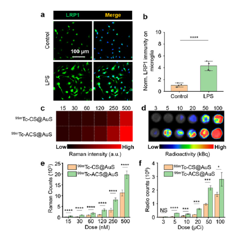 图5. 99mTc-ACS@AuS在炎性小胶质细胞中高摄取。(a)原代小胶质细胞经LPS或PBS处理后LRP1的免疫荧光染色图。(b)LRP1免疫荧光强度的半定量分析。(c)小胶质细胞的拉曼成像图像。(d)小胶质细胞的SPECT/CT成像图。(e)拉曼信号强度的定量分析。(f)SPECT信号强度的定量分析。