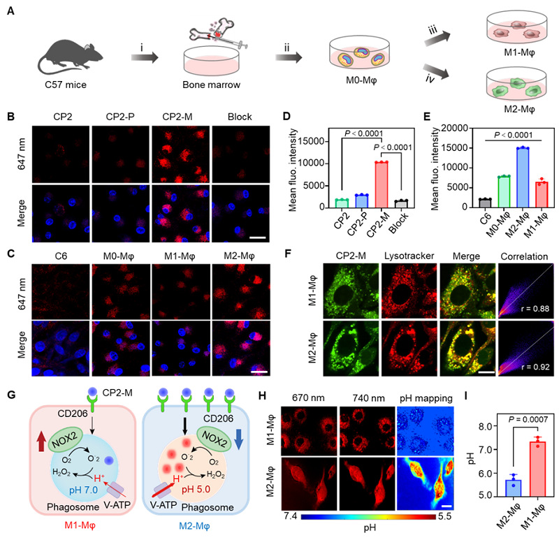图3. 目标探针CP2-M特异性地识别M2-Mφ。(A) 小鼠骨髓中分离的巨噬细胞的极化为不同表型的示意图。(B) CP2、CP2-P 或 CP2-M 与M2-MΦ共孵育后的荧光共聚焦显微镜图像。(C) 用 CP2-M处理 C6、M0-Mφ、M1-Mφ 和 M2-Mφ后的荧光共聚焦图像。 (D-E) 通过流式细胞仪统计分析CP2-M 在细胞内的平均荧光强度(MFI)。(F) 分别用 CP2-M 和 Lysotracker 处理巨噬细胞的荧光图像。(G)CP2-M 被M2-TAMs特异性摄取并响应溶酶体酸性的示意图。(H)CP2-M在巨噬细胞内的比率型荧光图像pH mapping。(I)CP2-M定量M1-Mφ 和 M2-Mφ内吞噬体的pH。