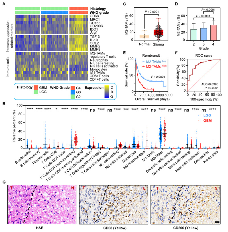 图1. 免疫抑制巨噬细胞(M2-TAMs)聚集在胶质母细胞瘤(GBM)浸润边缘。(A)热图显示TCGA-胶质瘤队列中的免疫特征。(B) TCGA 数据库显示低级别胶质瘤(LGG)与 GBM中的M2-TAMs在22种免疫细胞的相对百分比均为最高。(C)胶质瘤患者组织中M2-TAMs含量显著高于正常脑组织。(D)M2-TAMs 含量与胶质瘤的恶性程度(WHO分级)呈正相关。(E) Rembrandt 数据库中M2-TAMs百分比低(蓝色)和高(红色)的胶质瘤患者总生存率的 Kaplan-Meier 生存曲线。(F) 预测胶质瘤患者诊断的ROC曲线。(G)胶质瘤患者肿瘤样本的H&E、CD68 和 CD206 免疫组化染色图片。