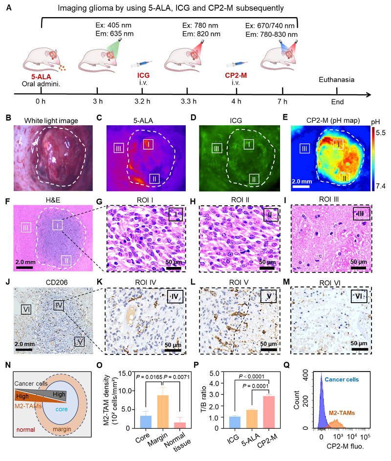 图 6. CP2-M靶向M2-TAMs定位GBM边界。(A)三种荧光探针对同一大鼠GBM模型进行活体荧光成像的流程图。(B)开颅后的脑肿瘤白光图、(C)口服 5-ALA、(D)静脉注射 ICG后肿瘤区域的荧光图像以及(E)静脉注射 CP2-M 后的 pH mapping图。(F) 对应大鼠胶质瘤(B)切片的H&E 染色图像以及 I 区(G)、II 区(H)和 III 区(I)的放大图像,比例尺:2.0 mm 和 50 μm(放大)。(J)肿瘤及周围区域 CD206+ TAMs 的免疫组织学染色。CD206+TAMs在IV区(K)、V区(L)和VI区(M)的空间分布。(N)胶质瘤中M2-TAMs和癌细胞的空间分布示意图。(O)肿瘤不同区域的 M2-TAMs 密度。(P)三种探针对于荷瘤鼠GBM成像的T/B 比率统计图。(Q)给药4小时后从肿瘤组织中分离的癌细胞和 M2-TAMs 细胞内CP2-M的流式定量分析。