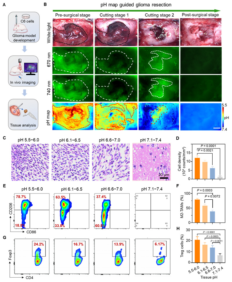 图 7. CP2-M通过勾勒肿瘤切缘pH图引导手术。(A) 荷C6胶质瘤大鼠模型建立、成像和组织分析的流程图。(B) CP2-M描绘的pH图实时引导下进行颅内胶质瘤的手术切除。不同pH肿瘤组织的(C)H&E 染色和(D)细胞密度统计。不同pH肿瘤组织中免疫抑制型M2-TAMs(E, F)和 Tregs(G, H)含量的流式细胞分析。