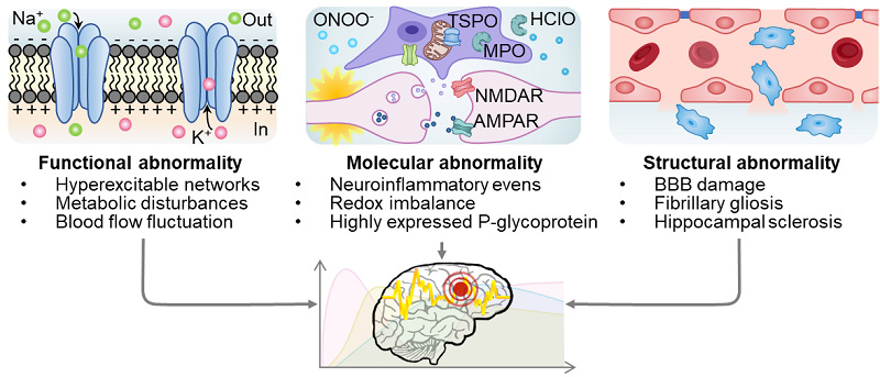 癫痫是一种常见的神经功能障碍性疾病,全球人口患病率接近1%,每年新增近500万。虽然目前临床批准20多种抗癫痫药,但仍有约30%癫痫患者无法通过药物有效控制,被称为难治性癫痫。相比普通癫痫患者,难治性癫痫患者伴有认知发育障碍,严重的社会歧视,死亡率和经济负担也显著增加。手术切除致痫灶是治疗难治性癫痫最有效的方法,相比于药物治疗,可使患者死亡率下降约3倍,无发作可能性提高25倍。准确定位致痫灶是实施手术干预的前提。临床常用脑电图、磁共振成像、正电子发射断层扫描、单光子发射计算机断层扫描等技术定位致痫灶,但由于癫痫的异质性和致痫灶隐匿性,临床仅有不到1%的癫痫患者最终接受了手术治疗。因此,开发可反映致痫灶演进的生物标志物并构建特异性良好的分子探针是致痫灶可视化的关键。