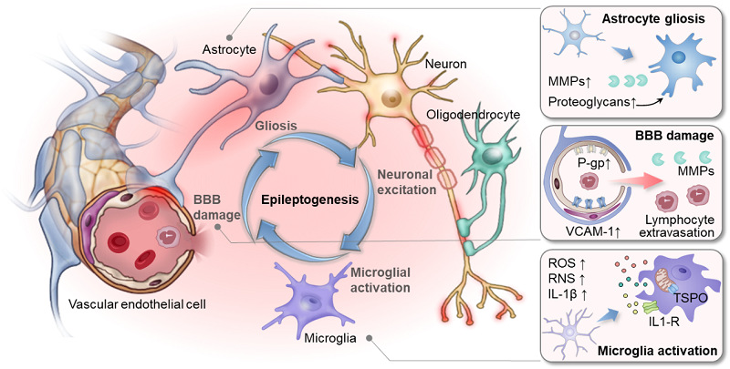 图2.神经血管单元稳态失衡导致神经炎症及癫痫发生的关键事件