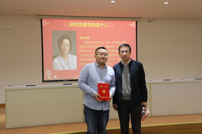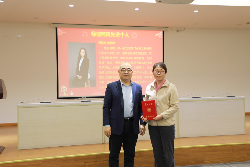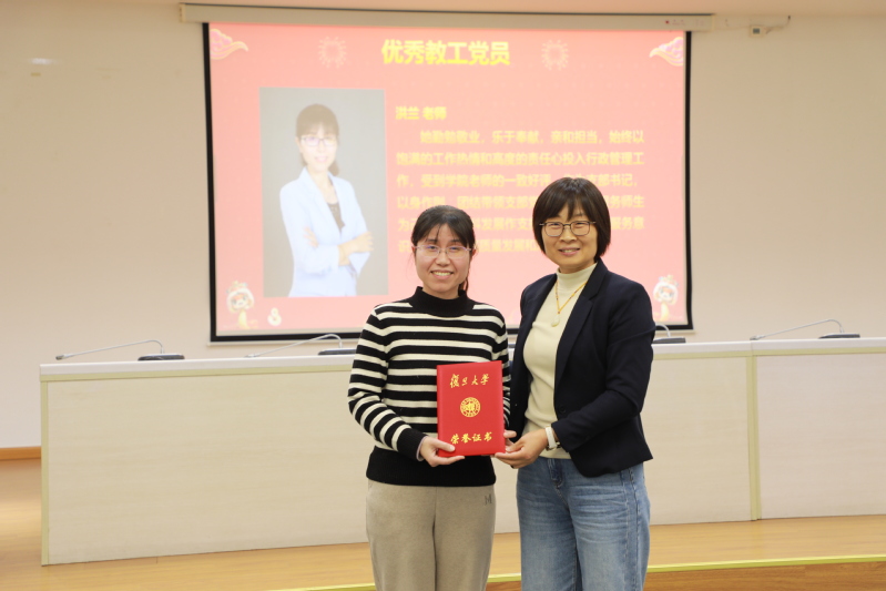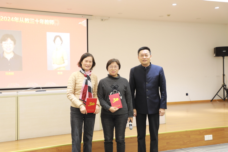 陆伟跃教授为冯美卿、陈瑛两位老师颁发从教三十年荣誉证书。两位老师恪尽职守,无私奉献,用心用情耕耘,培育出了一代代优秀的复旦学子。