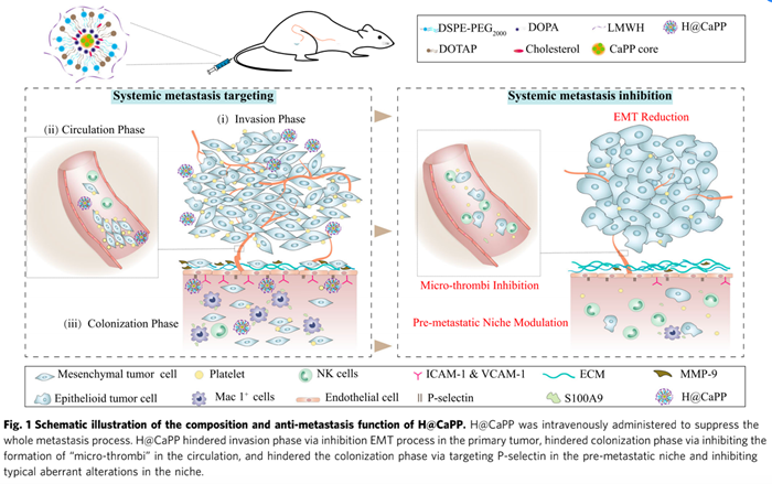 研究者首先将具有抗炎作用的低毒天然药物分子白皮杉醇合成为其磷酸化前药(Piceatannol phosphate, PP),通过反相微乳法将其制备成纳米沉淀核心,再通过薄膜水化法制备得到磷酸钙脂质体(CaPP),而后通过静电吸附作用在外侧搭载抗栓药物低分子量肝素(Low Molecular Weight Heparin, LMWH),最终得到全过程靶向肿瘤转移的纳米递送系统(H@CaPP)。H@CaPP外侧的LMWH能够与炎性内皮细胞和血小板表面的P-选择素结合,其既能发挥抗栓作用抑制循环阶段“肿瘤微栓”的形成,同时也将纳米颗粒靶向至肿瘤原位和“前转移灶”。纳米颗粒内部的PP发挥抗炎作用,通过上调原位肿瘤E-钙粘蛋白和抑制波形蛋白的表达,干预了侵袭阶段的EMT进程;通过抑制细胞间黏附分子-1、血管细胞粘附因子-1、金属基质蛋白酶-9和S100钙结合蛋白A9等蛋白的表达,抑制了“前转移灶”的发展,进而抑制了肿瘤转移的定植阶段(图 1)。作者通过系列实验验证了H@CaPP能够有效干预肿瘤转移的各个阶段,与传统的化疗和手术疗法联用后能明显抑制高侵袭性乳腺癌的转移并显著延长荷瘤小鼠的生存期,且具有良好的安全性。该研究为肿瘤转移的多靶点干预提供新思路,并具有临床转化前景。