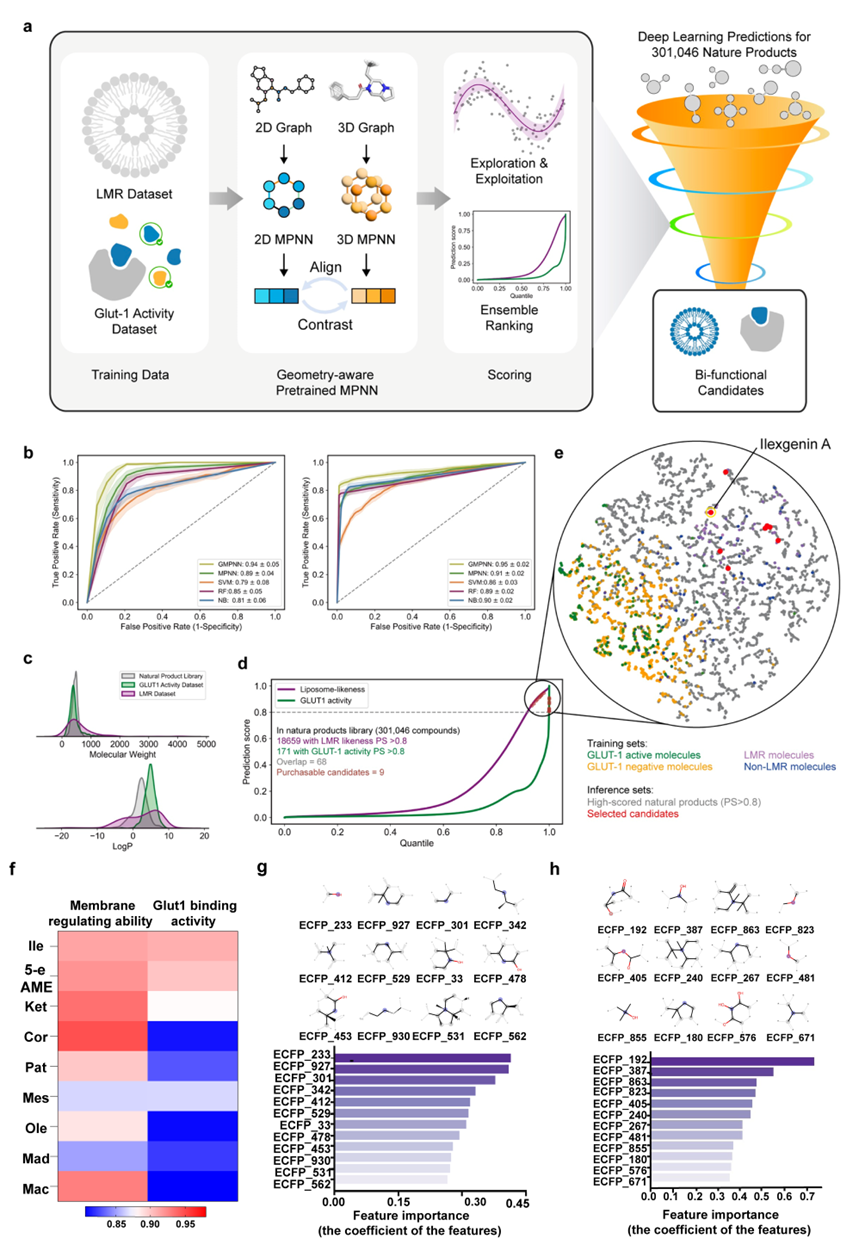 Traditional liposomes have limited tumor-targeting capabilities, which compromise their clinical efficacy. Although ligand-modified liposomes have shown potential in enhancing tumor-targeting efficiency, their complex manufacturing processes hinder clinical translation. Previous studies by the Prof. Wang’s team revealed that certain natural products possess both lipid membrane regulation (LMR) and tumor-targeting functions. This discovery suggests that replacing cholesterol in liposomes with these natural products could achieve tumor targeting without the need for ligand synthesis. However, with over 300,000 natural products available, traditional trial-and-error screening for such bifunctional natural products is time-consuming and labor-intensive.