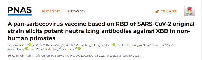 Recently, the research groups of Lu Lu, Shibo Jiang and Zezhong Liu from Fudan University published an article entitled“A pan-sarbecovirus vaccine based on RBD of SARS-CoV-2 original strain elicits potent neutralizing antibodies against XBB in non-human primates”in Proceedings of the National Academy of Sciences of the United States of America (PNAS). In this study, the authors have developeda pan-sarbecovirus vaccine that contains human Fc-conjugated RBD of ancestral SARS-CoV-2 strain as the immunogen and a novel STING agonist as the adjuvant (CF501/RBD-Fc). CF501/RBD-Fc could elicit extremely potent neutralizing antibodies against BA.2.2, BA.2.9, BA.2.12.1, BA.5, BA.2.75, and BF.7, as well as BQ.1.and XBB, which have both shown dramatic evasion of serum-neutralizing antibody activities. Meanwhile, the control vaccine, Alum/RBD-Fc, only elicited weak, or no, neutralization against BQ.1.1 and XBB. Notably, no significant difference (<4-fold) was observed in the neutralizing activity of sera in the CF501/RBD-Fc group against BA.2.2, BA.2.9, BA.5, BA.2.75 and BF.7 relative to D614G after 3 doses. Declines of 22.5-fold were found for XBB relative to D614G after 3 doses. The fold of reduction was significantly better than those reported before (66- to 155-fold) for the mRNA vaccines.