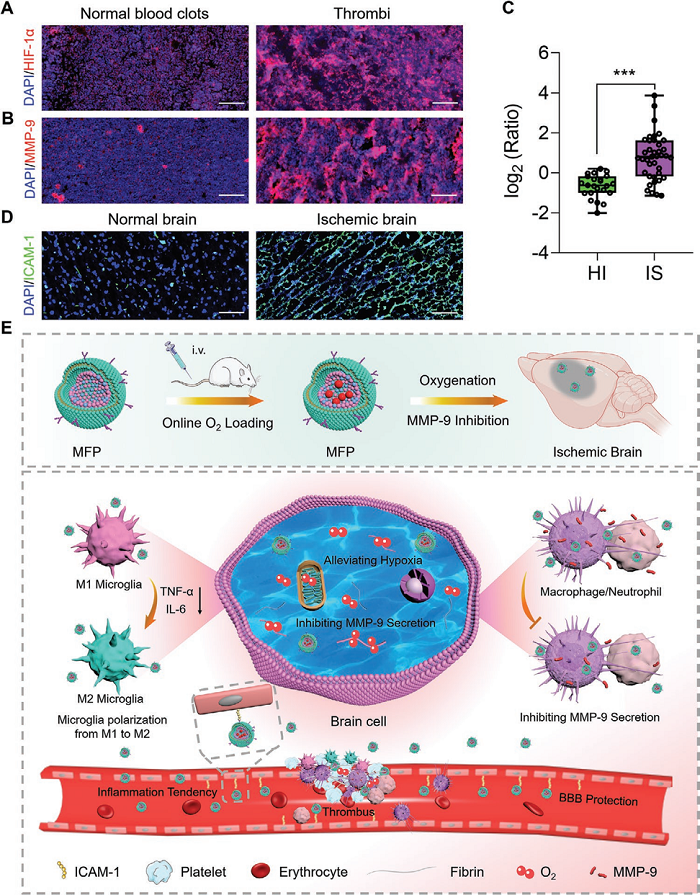 A team led by Professor Xianyi Sha from School of Pharmacy, Fudan University, and Professor Jing Zhao from Minhang Hospital, Fudan University, have reported a drug-free biomimetic oxygen supply nanovehicle for promoting ischemia-reperfusion therapy in stroke. In previous studies, they found that the hypoxia inducible factor-1 (HIF-α), a marker for hypoxia, and MMP-9, a marker for BBB damage, were highly expressed in thrombi of ischemic stroke patients (Fig. 1A, B). They synthesized a perfluoroundecane-derived amphiphilic polyfluorocarbon (PEG-SMA-F11) with an exceeding ischemia-oxygenation capacity. Additionally, they found that Pluronic P123 (P123), an amphiphilic block copolymer with excellent biocompatibility, was uniquely characterized in downregulating MMP-9. Based on the above research, they fabricated a drug-free biomimetic nanovehicle (MFP), in which the nanovehicle (FP) composed of PEG-SMA-F11 and P123 was camouflaged with M2 microglia membranes. MFP could load oxygen in vivo and preferentially access cerebral ischemic lesions in an inflammation-directed manner after intravenous injection. Subsequently, MFP elicited brain protection efficacy via enhancing oxygen and suppressing MMP-9 secretion in ischemic regions, conferring robust ischemic tolerance and reperfusion resistance of brain tissues for ischemia-reperfusion therapy (Fig. 1E).