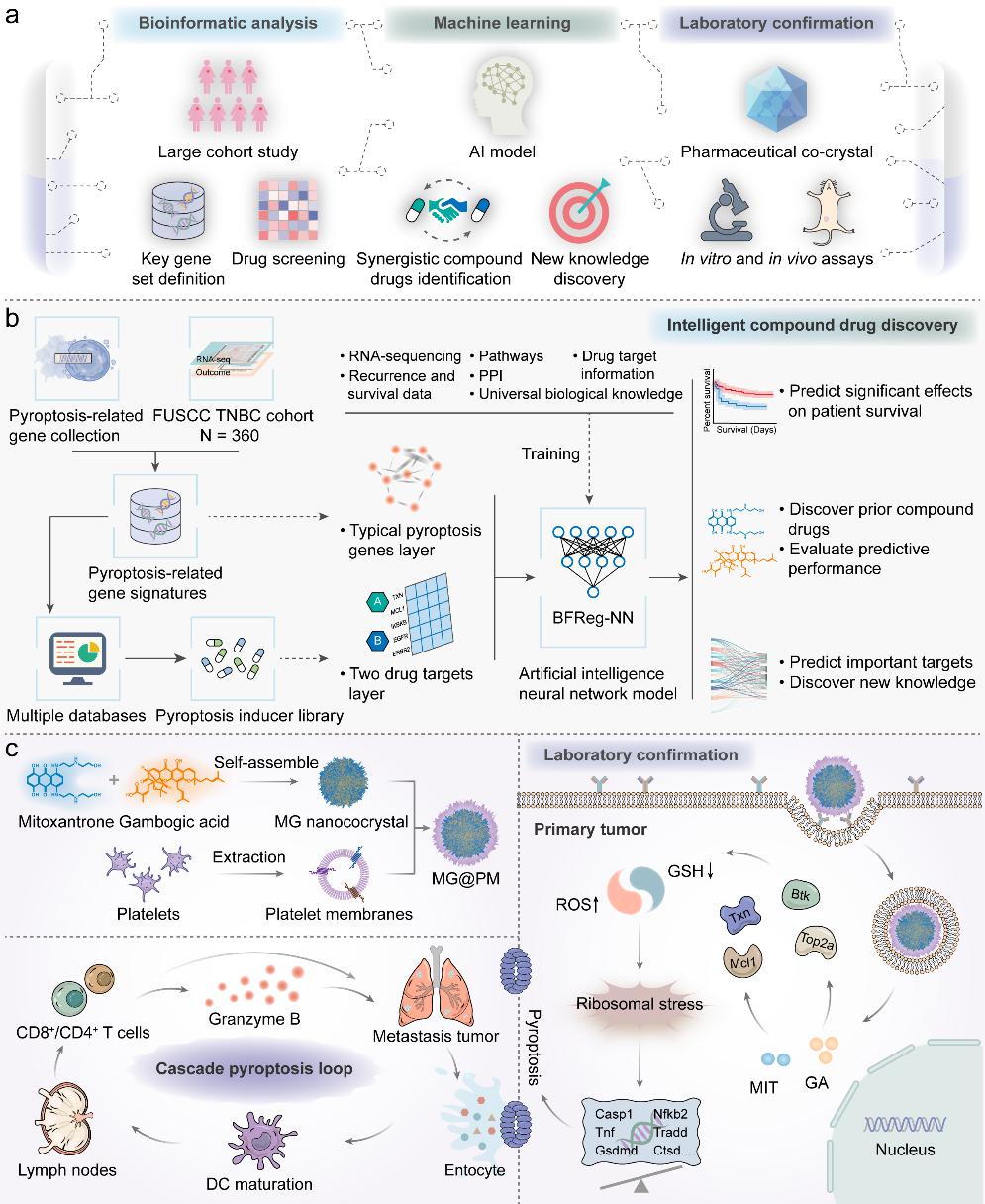 Subsequently, they adopted a biomimetic nanocrystal strategy to develop a novel formulation of the drug pair mitoxantrone and gambogic acid, named MG@PM, demonstrating strong pyroptosis induction and antitumor immune effects in TNBC models. The study revealed a unique mechanism where the combination drug targets regulate pyroptosis feature genes through ribosomal stress. The pyroptosis cascade effect activated by MG@PM in metastatic tumor models showed potential superior to the clinical regimen of Anti-PD-1/Abraxane. The integrated framework established in this work, which combines big data bioinformatics analysis, artificial intelligence, formulation development and experimental validation, represents a novel methodological approach, reflecting a multidisciplinary research model. This approach has significant implications for repurposing existing drugs, precision treatment of refractory diseases and drug development.