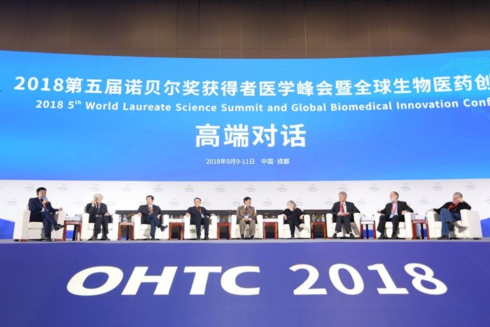 In the afternoon of September 10, 2018, Dr. Ming-Wei Wang (Director, the National Center for Drug Screening and Dean, School of Pharmacy, Fudan University), Mr. James Chen (Chairman, Hollyhigh International Capital) and Dr. Dan Zhang (Chairman, Fountain Medical Development Ltd.) participated in a peak-level dialogue with Drs. Peter Agre (2003 Nobel Laureate in Chemistry), Aaron Ciechanover (2004 Nobel Laureate in Chemistry), Ada E. Yonath (2009 Nobel Laureate in Chemistry), John B. Gurdon (2012 Nobel Laureate in Physiology or Medicine) and Edvard I. Moser (2014 Nobel Laureate in Physiology or Medicine), covering topics such as key elements and critical paths for biopharmaceutical industry original innovation and sustainable development. The event was chaired by Mr. Zhiran Zhang (Vice President, China Pharmaceutical Industry Association) and is a main program of the ongoing 5th Nobel Laureate Science Summit and Global Biomedical Innovation Conference