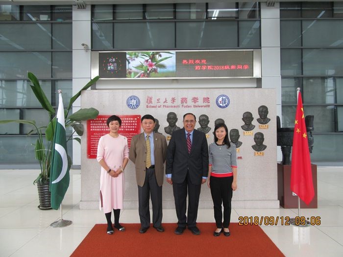 In the morning of September 12, 2018, Professor Atta-ur Rahman (Foreign Associate of Chinese Academy of Sciences, Recipient of 2014 Friendship Prize of China, Fellow of the Royal Society (U.K.) and Former President of Pakistan Academy of Sciences) visited School of Pharmacy, Fudan University. He was accompanied by Madam Xuying Yan (Sales Manager of BENTHAM SCIENCE Publishers Ltd.) and warmly received by Drs. Ming-Wei Wang (Dean) and Yan Li (Assistant Dean). Dr. Wang thanked Dr. Rahman, his schoolmate at Cambridge University, for taking time to visit Fudan from his busy traveling schedule in China. They discussed in great detail relative to forging a close collaboration via personnel exchange, scientific research and resource sharing.