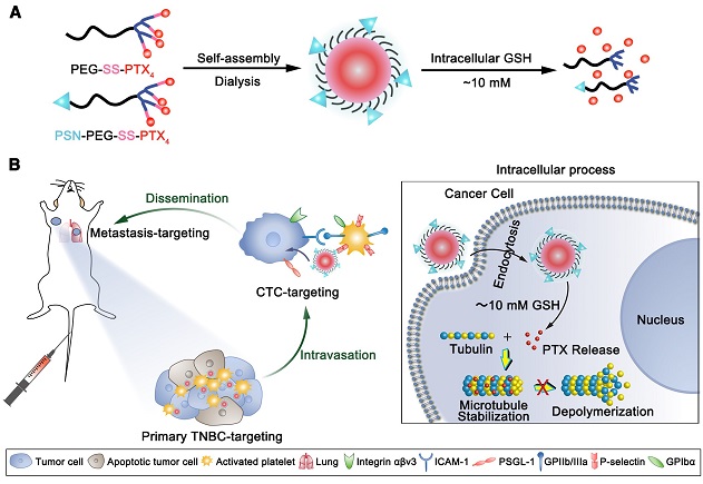 Recently, Professor Jiang Chen (corresponding author) Group of Fudan University developed a novel activated platelets-targeting micelle with controlled drug release to utilize activated platelets as an endogenous device for efficient drug delivery to both primary/metastatic tumors and significantly improves treatment outcome. In this work, a P-selectin (expressed on activated platelet surface) targeting peptide (PSN) is modified on a redox-responsive paclitaxel-loaded micelle (PSN-PEG-SS-PTX4 micelle) to utilize activated platelets as a “bridge” for interaction with cancer cells. The PSN-modified micelle can easily adhere to the surface of activated platelets and subsequently capture CTCs in blood circulation. PSN-PEG-SS-PTX4 micelle also exhibits enhanced primary TNBC/metastasis targeting and penetrating effect through binding with tumor infiltrating platelets. Subsequently, the micelle could be endocytosed by cancer cells and then disintegrated to release loaded chemotherapeutics under reductive cytosol conditions to induce strong anti-tumor effect. More importantly, PSN-PEG-SS-PTX4 micelle potently suppressed lung metastasis of TNBC and reduced incidence of distant liver metastasis. In conclusion, the activated platelet-targeting micelle with controlled drug release profile provides a promising strategy for the omnidirectional treatment of primary and metastatic cancers.