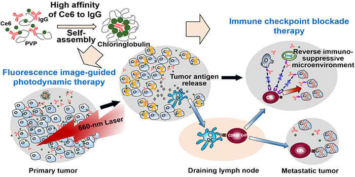 The research group occasionally found that immunoglobulin G (usually called antibody) inherently bound to the photosensitizer Chlorin e6 in a high affinity. They developed a so-called “hitchhiking technique” to use the antibody to carry the photosensitizer to the tumor without changing its clearance rate in blood. This preparation method allows to co-deliver single or multiple checkpoint inhibitor antibodies and the photosensitizer in a single setting for the intraoperative fluorescence image-guided cancer photodynamic and the checkpoint blockade therapy.