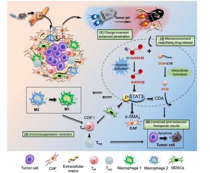 In response to the above characteristics of pancreatic cancer, the research group developed a multifunctional drug delivery system combining lipid-modified gemcitabine and stroma-targeted drug HJC0152 to overcome the above difficulties and successfully achieve a deep level drug delivery. Specifically, charge reversal at the tumor site was achieved by constructing amphiphilic block materials responsive to the tumor acidic microenvironment, and the block materials encapsulated two drugs by forming micelles: hydrophobic gemcitabine could improve the drug resistance of tumor cells and enhance drug toxicity and the lack of oxygen-responsive drug HJC0152, which specifically targets STAT3 targets, plays a role in re-educating the whole tumor microenvironment.