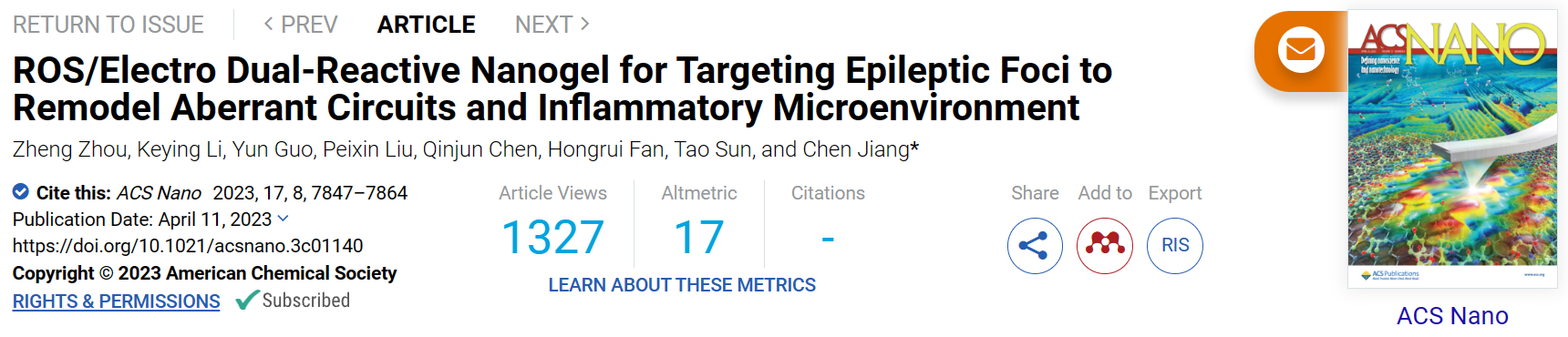 Recently, the research group led by Prof. Chen Jiang has reported a hydrogel nanoparticle drug delivery system, or namely nanogel, which is hopeful to address several problems facing the currently prevalent anti-epileptic drug therapies in epileptic treatment. The study was published online in ACS Nano, named ROS/Electro Dual-Reactive Nanogel for Targeting Epileptic Foci to Remodel Aberrant Circuits and Inflammatory Microenvironment.
