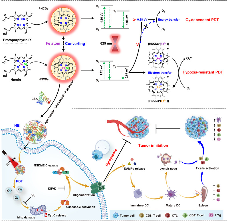 本研究通过简单溶剂热处理将无光敏活性的氯化血红素(Hemin)转化成具有红光光敏活性的纳米光敏剂,其具有良好的生物相容性和抗乏氧ROS生成能力。研究发现HNCDs 继承了 Hemin 的单原子 Fe-N4中心,并创造了sp2杂化的碳环境,减少了激发三重态(T1)和基态(S0)之间的能级差,促使能量转移被转换为电子传递,促使超氧自由基(O2• −)的生成,从而将光动力过程由氧气依赖型转化为抗乏氧型。为了提高HNCDs的体内应用,用血清白蛋白对HNCDs进行包裹得到均匀的HB光敏纳米粒,即使在缺氧环境也能通过 Caspase-3/GSDME 途径显著诱导癌细胞发生焦亡,激活强烈的抗肿瘤免疫反应,有效抑制了三阴性乳腺癌的生长和转移。