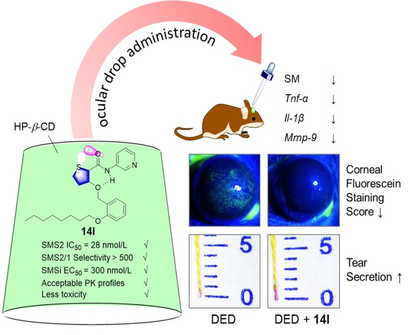随着生活方式的改变和电子产品使用时间的增加,全球范围内干眼症(DED)的发病率大幅上升,对患者的视力健康和日常生活造成了极大的困扰。DED的主要特征是眼表炎症和泪膜高渗。由于泪液分泌不足或泪膜脂质层不稳定,导致泪液蒸发加快,引发泪液高渗和炎症,进而造成眼表损伤和DED的发生。人工泪液和环孢菌素等现有治疗药物因疗效有限且副作用大而导致患者的依从性差,故亟需开发更加安全有效的新型DED治疗药物。研究表明,DED患者的眼表组织尤其是睑板腺中鞘磷脂(SM)水平和促炎因子水平均显著升高。鞘磷脂合酶2(SMS2)是负责哺乳动物体内SM生物合成的最后一步关键酶,其在小鼠体内的基因敲除不仅能发挥显著的抗炎活性而且具良好的安全性。因此,SMS2或有望成为治疗DED的潜在全新药物靶标。