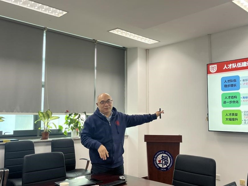 随后,王建新书记从人才现状、人才引育工作举措、存在的问题和人才队伍建设规划等方面介绍了学院人才工作整体情况。首先,通过与各院校国家级高层次人才的各项数据对比,以及院内各层次人才学科分布情况,分析了学院人才队伍现状,梳理了现阶段人才引育工作存在的问题及制约因素。接着,王书记结合学校人才引进政策和主题教育调查研究情况,介绍了下一阶段学院人才引进的目标、思路及举措,强调各党支部要以更积极的态度,更有力的举措将人才工作抓牢、抓实,积极推荐本领域拟引进各类人才的目标对象,学院将加大高层次人才引进力度,抢抓机遇、主动出击,同时充分利用原创新药研究院等平台建设机会,积极构建“大药学”人才体系,健全人才培育“一人一档”体系,加快建设高水平人才高地,为学院“十四五”发展规划提供人才队伍保障。