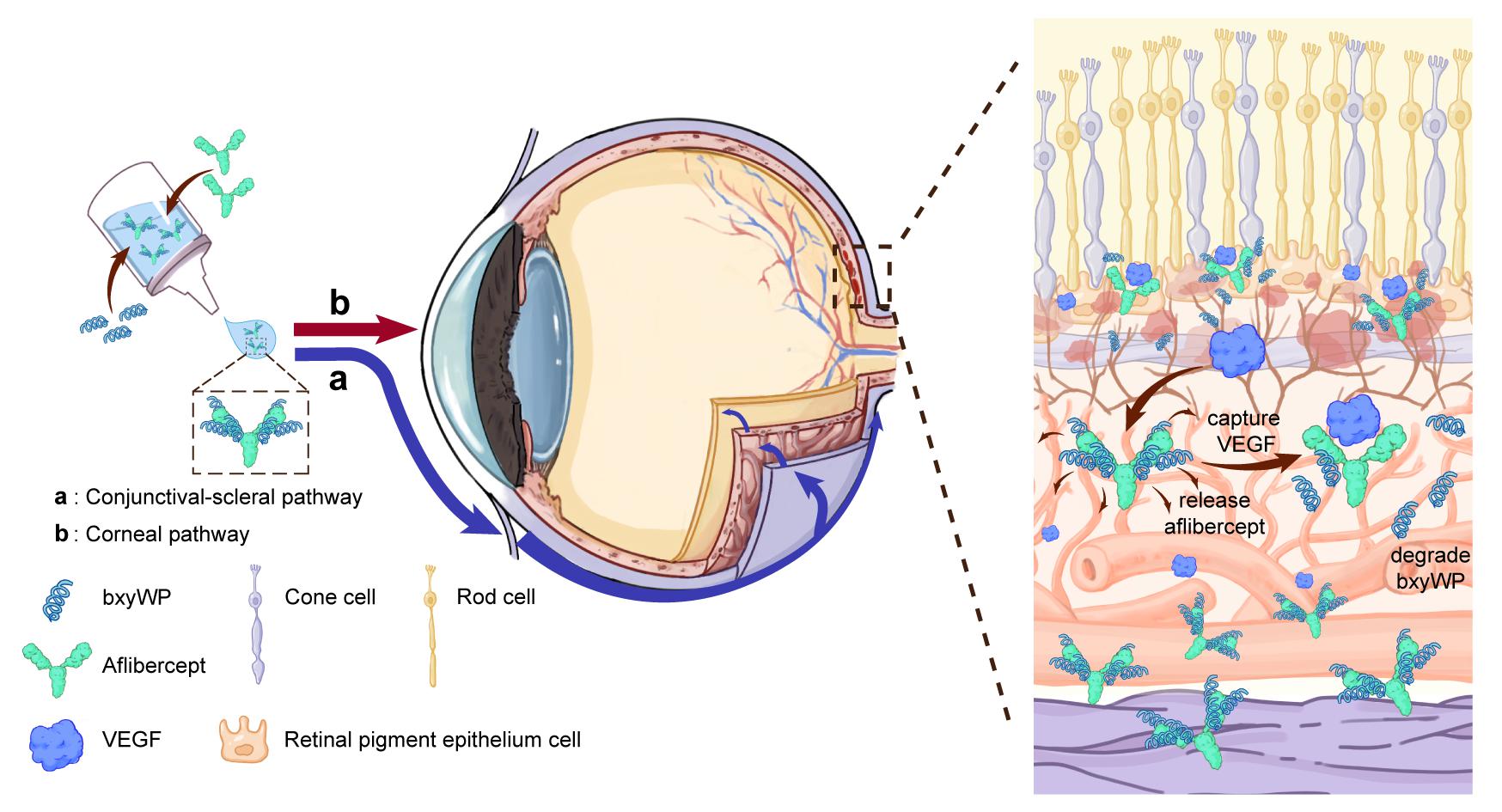 以湿性老年黄斑变性(wAMD)为代表的新生血管性眼底疾病,主要累及视网膜和脉络膜等关键眼底组织。这些病变部位的新生血管极易发生渗漏或破裂,导致视网膜水肿或黄斑区出血,是老年人视力受损和失明的重要原因。由于眼睛存在多重吸收屏障,目前临床上药物治疗wAMD的标准方案为玻璃体腔注射抗血管内皮生长因子(VEGF)的蛋白药物,其中阿柏西普的应用最为广泛。这种侵入性的给药方式对医疗条件要求较高,且患者需多次注射,容易引发玻璃体出血、炎症、视网膜脱落等并发症,患者的依从性差。若能实现蛋白药物的无创眼内递送,将使患者能够居家自主用药,从而彻底改变现有wAMD的治疗模式,为患者带来更大的便利和更好的治疗体验。