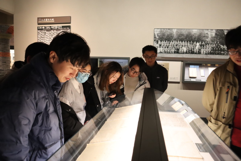 下午,在交大同学们的带领下,两校学子一行人参观了交大校史博物馆。文博楼校史馆建于1996年,以“因图强而生,因改革而兴、因人才而盛”为主题,展现了上海交大百余年的历史变迁、卓越共享和精神传统。老师和同学们从一楼的诗歌展,一路参观走到三楼交大的校史展,对交大的历史和精神传统有了更深的了解,也感受到了两校共同赓续至今的红色精神。
