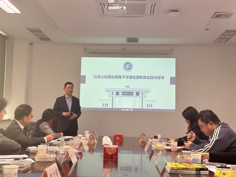 最后,郑东老师以“社会认知理论视角下生涯教育思考与实践”为题进行了交流分享,首先他以诙谐幽默的语言直击目前生涯工作的痛点,包括就业课程单一、就业师资不足、规划方式手段单一、没有充分利用职业资源等,此外郑东老师也分析了目前00后大学生普遍存在的就业问题,包括慢就业、慢成家,以及学生思维明显、求稳心态明显等特点,而后他从社会认知理论视角分析了“慢就业”的成因,并指出我们需要从大一开始就业指导,需要全领域的生涯服务支持。郑东老师在就业宣传工作中致力于挖掘学校内的“普通人”的生涯故事,包括“挂科无数”的本科生拿到20多份offer的故事、化工专业本科生前往美的集团工作的故事以及艺术类本科毕业生前往腾讯工作的故事等,通过在校内宣传这类平凡人的不平凡选择,以期望帮助同学进一步明晰就业方向,学会抉择,而不是盲目跟风。