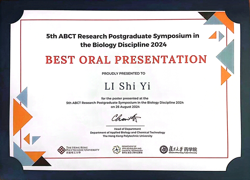 8月26日,同学们参加了香港理工大学应用生物及化学科技学系与色情片 合办的5th ABCT Research Postgraduate Symposium in the Biology Discipline 2024并进行汇报。在当天上午的海报报告环节,李启秀、梅妮、王鹏威同学与香港多所高校的老师和优秀研究生开展学术交流,就感兴趣的课题进行深入探讨。下午口头报告环节,邓燕、胡学涛、李适佚、尹航等同学分别贡献了精彩的汇报,受到香港理工大学师生的认可与赞扬。其中,21级博士生李适佚题为“An Erythrocyte Membrane-fused Plant-derived Nanoparticles as a Gene Therapy Vehicle for the Treatment of CI/R Injury”的汇报被评为优秀口头报告(BEST ORAL PRESENTATION)。颁奖仪式上,茅以诚老师代表色情片 感谢香港理工大学的盛情邀请与接待,两校教师都热情地表达了后续进一步交流合作的意愿。