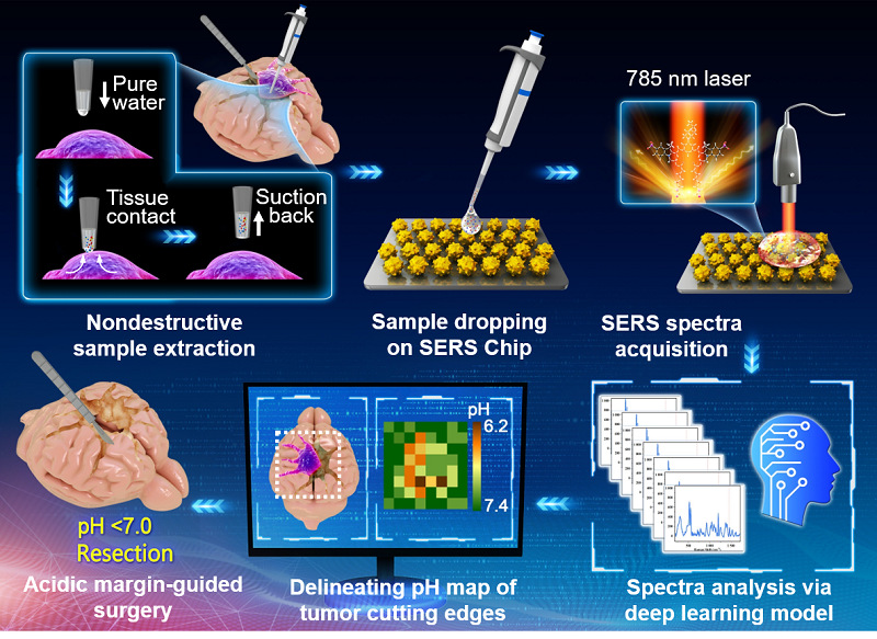 图1. 智能拉曼手术导航系统示意图。该系统由自主研制的SERS芯片,手持式拉曼光谱仪以及深度学习模型组成。提出了水滴辅助组织取样技术,将可疑组织区域代谢物无损地转移到SERS芯片上。拉曼光谱仪采集SERS芯片上拉曼信号并通过深度学习模型测定样本酸度并描绘手术切面pH分布图。