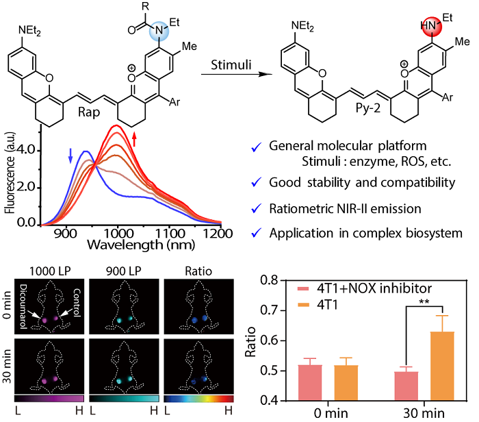 近红外二区(NIR-II)荧光成像具有穿透深度深、光散射弱等优点已被广泛用于活体深层组织荧光成像。目前 NIR-II 区的荧光探针主要是“关-开”型探针,此类型荧光探针可以选择性被活体内的特定底物激活,从而给出信号,但它们只能实现“有”和“无”的信号改变,利用“关-开”型荧光探针可以实现对肿瘤微环境中特定底物如酶、ROS/RNS定性的可视化监测,但不能实现定量变化的监测。相比而言,比率型荧光探针由于可以通过多个通道采集信号再把各通道信号进行关联,具有自我校正功能,可以实现定量分析监测。但截至目前为止,NIR-II区比率荧光探针和探针设计策略都比较少,且能实现检测的底物种类以强氧化性物质为主,不能满足对酶等生物分子的检测需求。