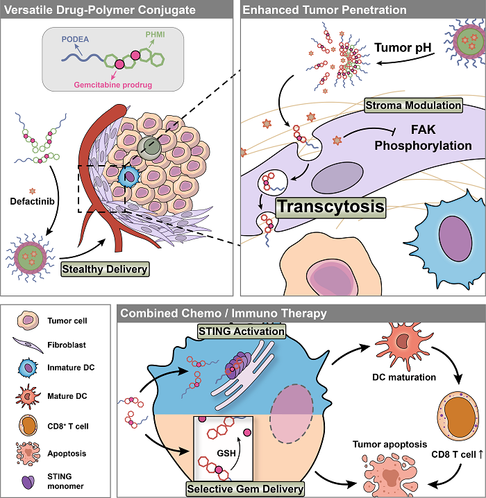 本研究中,不同于常见的调节纳米粒尺寸或表面电性等物理特性的策略,作者开发了一种可以触发转胞吞作用的药物递送系统,以实现对PDAC的深度穿透。这种策略完美契合了PDAC基质细胞过度增殖的病理特征。被包封的地法替尼可响应弱酸性微环境释放,并抑制FAK磷酸化以软化肿瘤基质。由于转胞吞作用,基质细胞从“看门人”转变为“搬运工”,并将药物-聚合物偶联物主动转运至肿瘤深部。一线化疗药物吉西他滨可在细胞内高水平GSH的作用下释放,选择性抑制PDAC细胞的增殖。此外,该偶联物还可诱导STING单体的聚集以激活抗肿瘤免疫应答。总之,本文报道的药物递送系统由于其特殊的设计,较之传统设计显示出更好的肿瘤穿透性,并且在原位PDAC模型中显示出优异的抗肿瘤效果。此外,该递送系统具有高度兼容性,可以作为一个有潜力的药物递送平台,通过偶联或包载其他药物应用于PDAC的联合治疗。