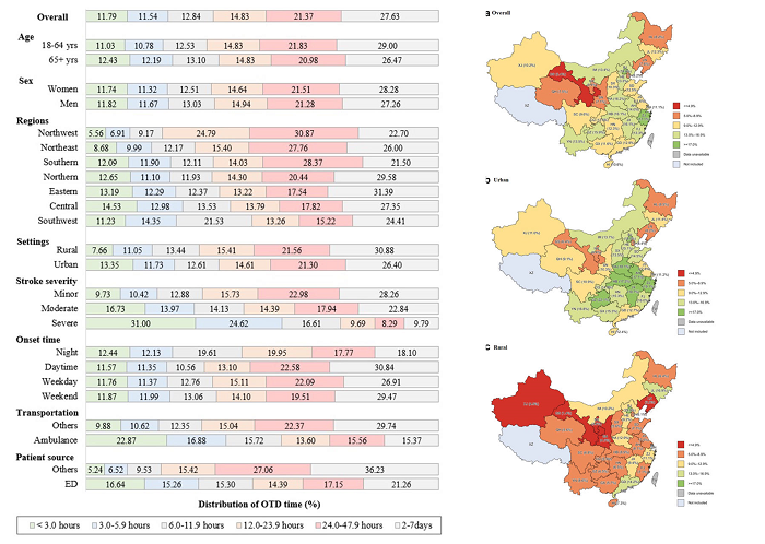 该研究以院前延误时间窗为切入点,将OTD(从发病到入院)时间划分为0-3h、3.0-5.9h、6.0-11.9h、12.0-23.9h、24-47.9h、2-7d,重点关注3h黄金治疗窗,主要研究指标为3h内入院率。以中国脑血管病大数据平台(BOSC)的多中心登记数据为数据源,该研究最终纳入了全国78389位发病后7日内的卒中患者,按年龄、性别、省份、地理区位、城乡、卒中严重程度、发病时间(白天或夜晚、工作日或周末)、转运方式、患者来源划分为不同亚组,分别定性定量描述其OTD时间和3h内入院率(见下图)。