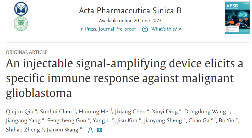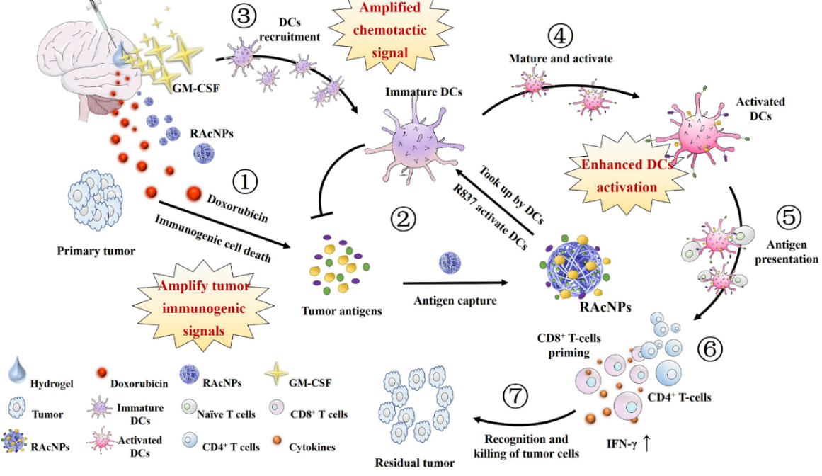 胶质母细胞瘤(GBM)是最常见和致死率最高的颅内肿瘤,具有极强的侵袭性和免疫逃逸能力。外科切除是临床上治疗GBM的主要途径,然而,由于其浸润性生长的特征,术后复发几乎不可避免。近年来,免疫治疗因其疗效好、安全性高被广泛用于多种恶性肿瘤的治疗,但至今尚未在恶性GBM中取得突破。由于大脑中淋巴途径不完善,免疫细胞数量尤其是树突状细胞(DCs)数量稀少,不容易诱发特征性免疫响应,所以中枢神经系统被认为具有“免疫特权”。同时,GBM属于典型的冷肿瘤,免疫原性低且进化出多种免疫逃逸机制,以对抗机体的免疫监视和毒性T淋巴细胞的攻击。上述原因导致GBM对于免疫疗法不敏感,也给通过系统给药治疗GBM复发带来了极大困难。