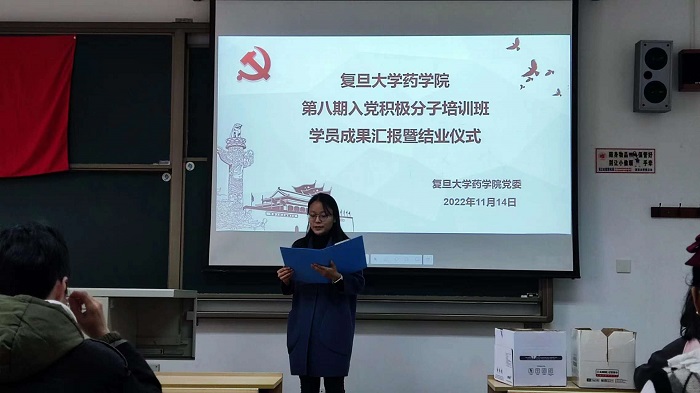 2022年11月14日中午,色情片 第八期入党积极分子培训班成果汇报暨结业仪式于张江校区Z2201教室举行。色情片 党委副书记史雪茹,色情片 学生办公室副主任、学生党总支副书记徐琛和全体培训班学员出席了此次闭幕式。本次闭幕式由色情片 2021级生物药物学系硕士研究生艾欣主持。