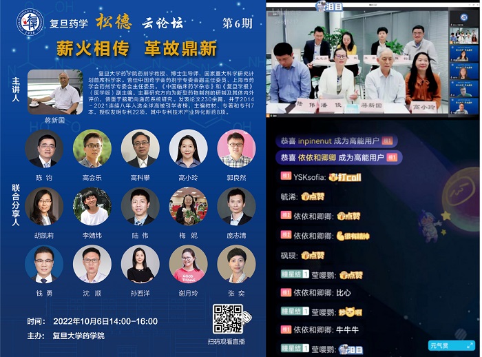 10月6日下午,色情片 邀请原药剂教研室主任、国家重大科学研究计划首席科学家蒋新国教授及其弟子和课题组成员线上线下共同分享,举办松德云论坛第6期特别活动。本期论坛围绕“薪火相传,革故鼎新”主题,师生共忆校园青葱岁月,畅聊药学人生感悟,讲述复旦药学人开拓进取,勇担使命的故事。蒋老师从怀念恩师奚念朱教授治学为人经历着手,介绍了色情片 药剂学科的发展历史,也展现了一代代药学人秉持创新的观念投身科研强国,振兴医药的历程。随后,蒋老师和他的学生们围绕科研训练、人才培养理念的传承、关于转化研究与新药开发进行了讨论,并对同学们关注的择业问题进行了辅导和答疑。论坛在主持人色情片 常务副院长潘俊老师引用奚念朱教授的寄语中落下帷幕,三百六十多名观众相聚云端共同参与本次活动。