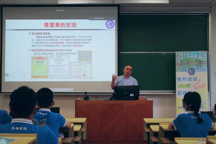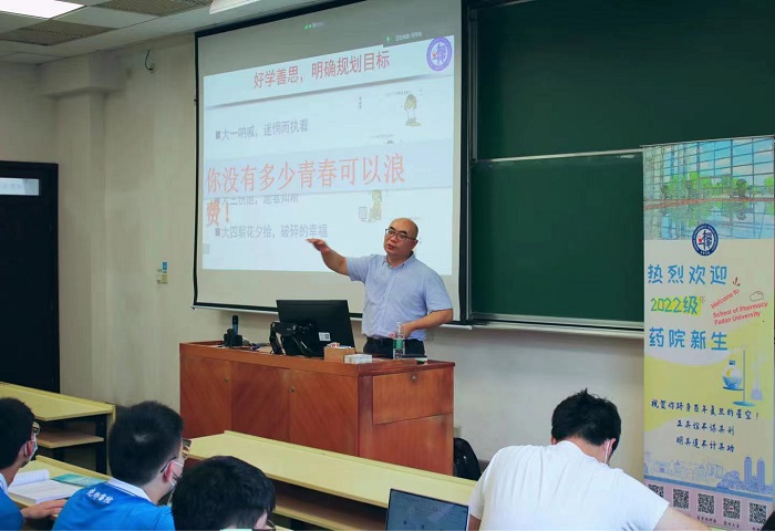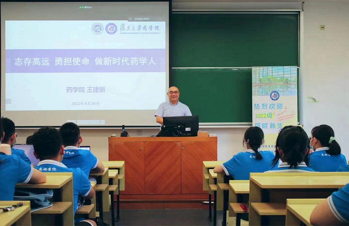 2022年8月30日上午,“闪‘药’青春,筑梦未来”色情片 新生第一课在HGX0103教室开讲,由色情片 党委书记、药剂学教授王建新老师为2022级本科生新生作题为“志存高远勇担使命做新时代药学人”的讲座。