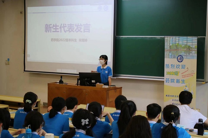 课程开始前,宋雨婷同学作为2022级新生代表发言。她深情而生动地抒发了所有新生们迈入复旦校园、成为“复旦人”的骄傲与自豪之情。优美的校园环境、热情的学长学姐、亲切友好的导师教授,一切关怀如春风化雨无微不至,让每个人深深着迷而又自然融入。同时,她倡议学生们应该承担起大学生的责任与担当,不惧挑战,相信只要付出充分的努力,“必将前程似锦”!